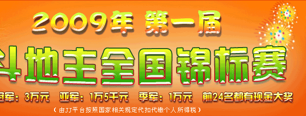 为了能给大家带来更丰富好玩的赛制,更重量级的奖励。我们决定在2009年7月1日这一天,举办我们的第一届全国性的斗地主锦标赛,即:2009第一届斗地主全国锦标赛,本次比赛是全体玩家都可以免费参与的,总奖励达到了10万元的额度。希望大家能积极踊跃参与,取得好的成绩!同时也感谢长期以来支持我们的玩家,因为有了你们,JJ比赛才会变的更好!